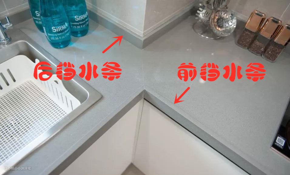 后挡水条,是为了防止台面上的水流到台面与墙壁之间的缝隙里去。这里是个坑,最容易积水。前挡水条,是为了防止水顺着台面流下来,污染了柜门。