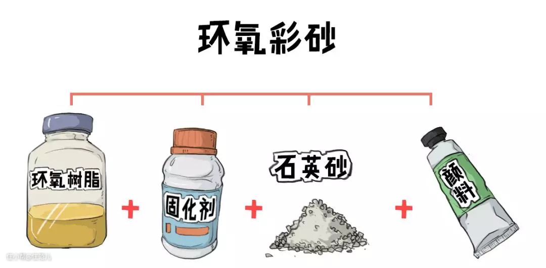 环氧彩砂的原材料也是环氧树脂,只不过做了改良——就像水泥+砂子=更坚硬的混凝土,环氧树脂+石英砂=更坚硬的环氧彩砂。