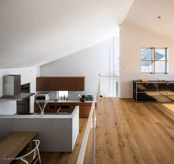 再上去就是厨房和餐厅了,开放式的二字型厨房里,整排的橱柜设计解决了做饭厨具的储存问题,灶台前面还特地抬高了20公分,下面既能收纳,又能遮住杂乱的台面,这种设计在日本是很流行的。