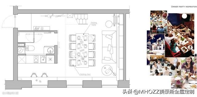 如果想聚会开趴,需要个宽敞的就餐环境(再注意看沙发的朝向),那就将沙发移动到书架墙处,腾出可以放下餐桌餐椅的地方就ok了,接下来就狂欢吧。▼