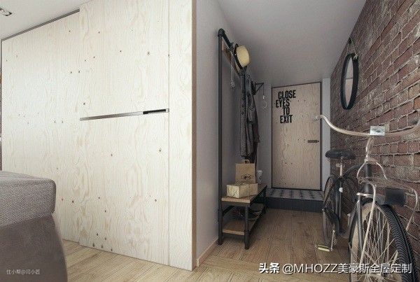 玄关处摆放的也很合理,有换鞋凳,衣帽架,镜子,还可以放自行车,储物柜子,一点也不觉得拥挤。墙面是文化砖,有种浓浓的复古文化气息,刚一进来,一定会被这面墙吸引。▼