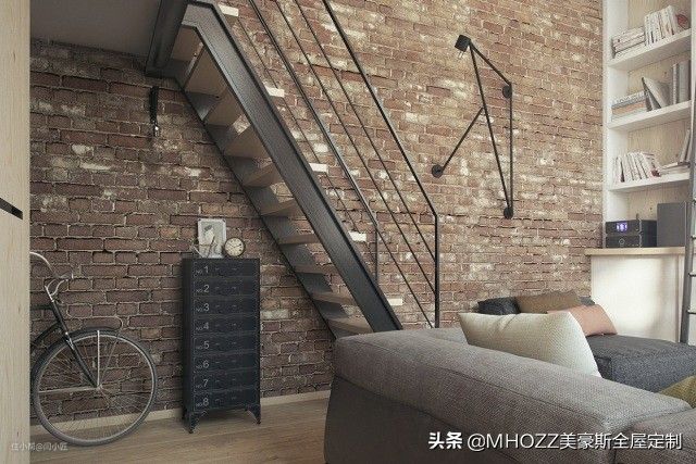 从这样角度看,感觉这个客厅很舒适,工业风的吊灯,复古铁梯,硬朗的风格中再搭配舒适的家居,比如单色的布艺沙发和北欧风格的靠包,非常有品位啊。▼