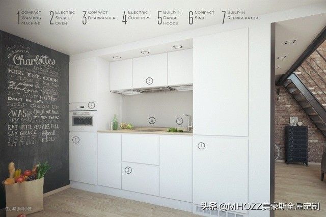 厨房在一楼,吧台、黑板墙、咖啡角一个都不少,并且橱柜分配合理,每个空间都有对应的功能,这样做起饭来也不会手忙脚乱,找不到东西。▼
