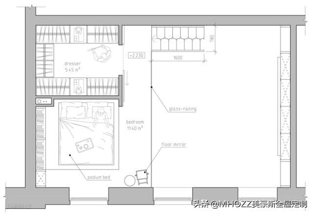 二楼的卧室,整体风格很舒适,选用的地台作为床,背景墙(其实是也是衣帽间的墙)简约大气、还有一些自然的气息;地台旁边是书架储物柜子,看样子可以放不少的东西,有封闭的,有不封闭的,杂而不乱。▼