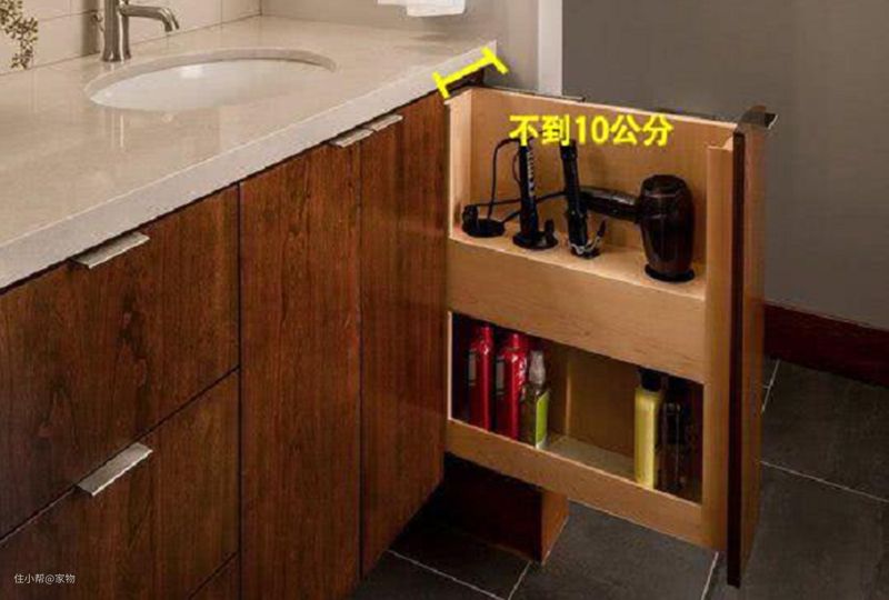 卫生间的洗漱池下方一般会打造柜子,但是洗漱用品众多,只是一个小小的吹风机,就占据了很大的空间,但是打造了竖着的抽屉,就轻松解决了这一问题。