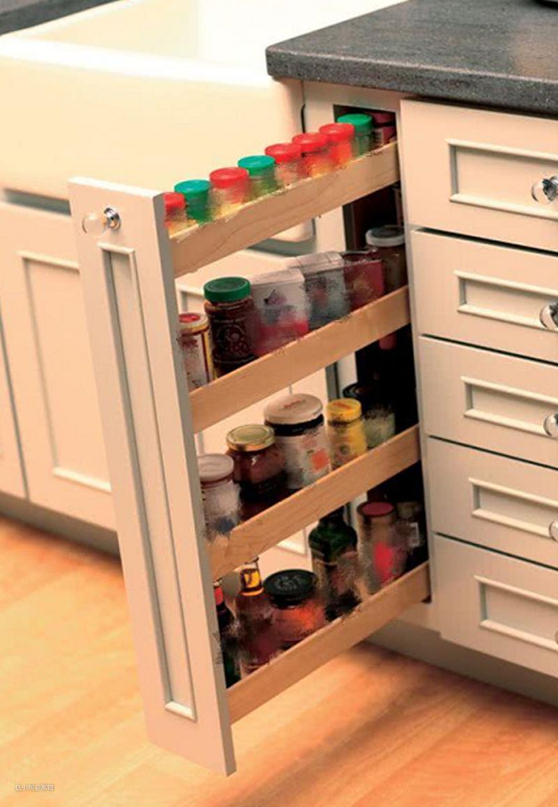 而且将调料收纳在这样的抽屉内,取放也是很方便的,做饭的时候将抽屉打开,里面的调料一目了然,再也不用为找不到调料手忙脚乱了。
