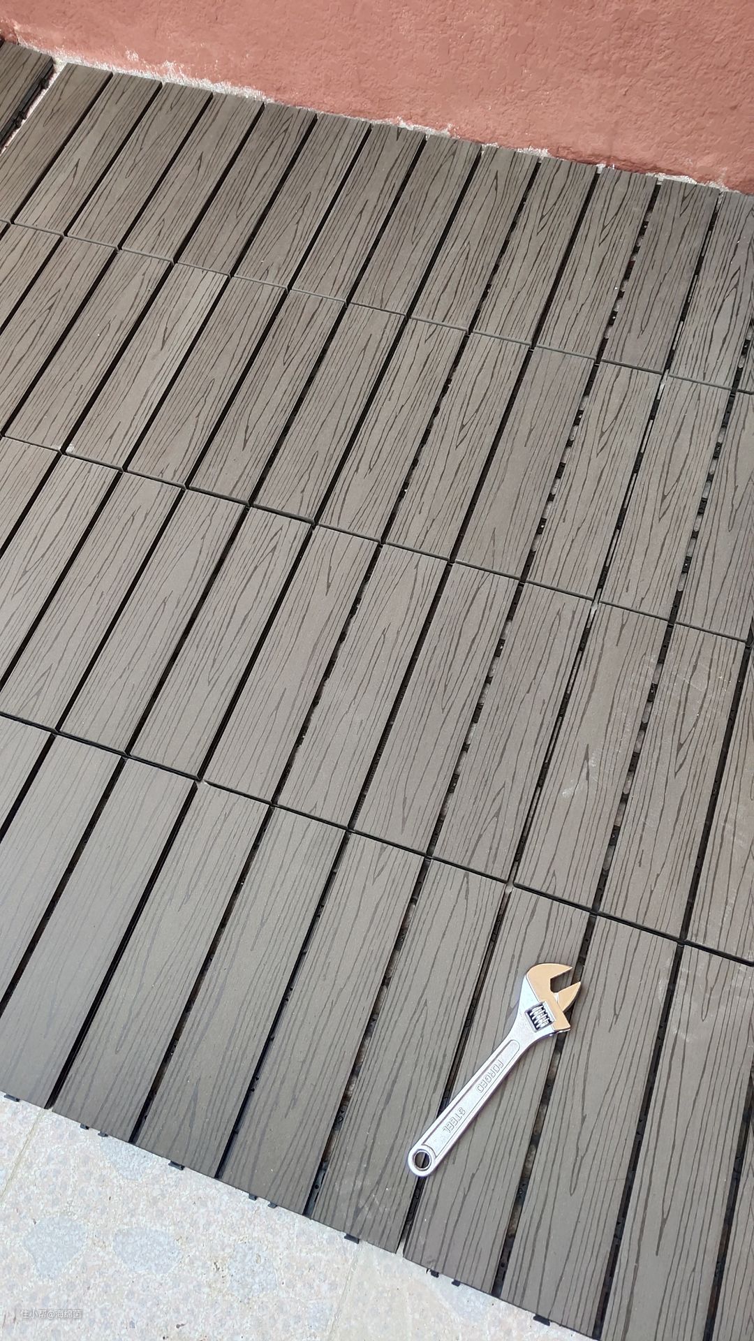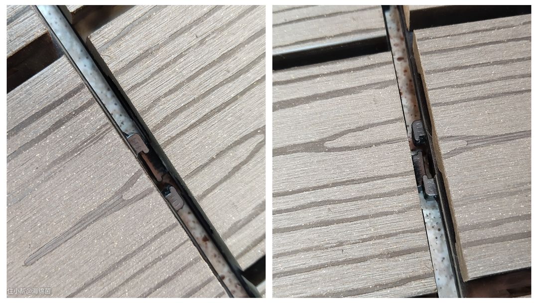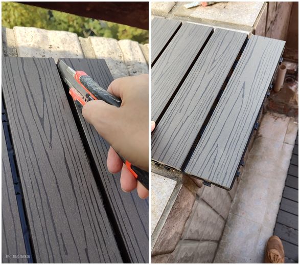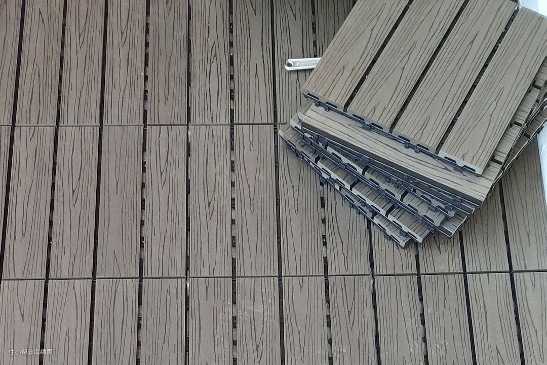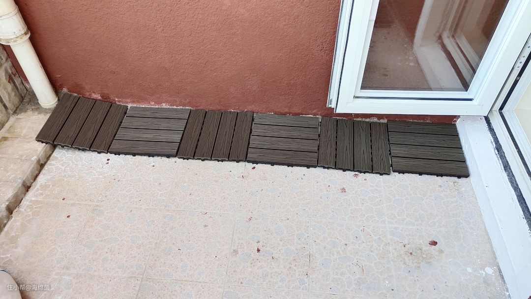 塑木地板有一定的厚度,底下还有塑料支撑,所以视觉上基本能完全盖住地面,下图可以看到粉红色的瓷砖在铺上地板后就完全看不到了,同时整体脚感挺平整的。