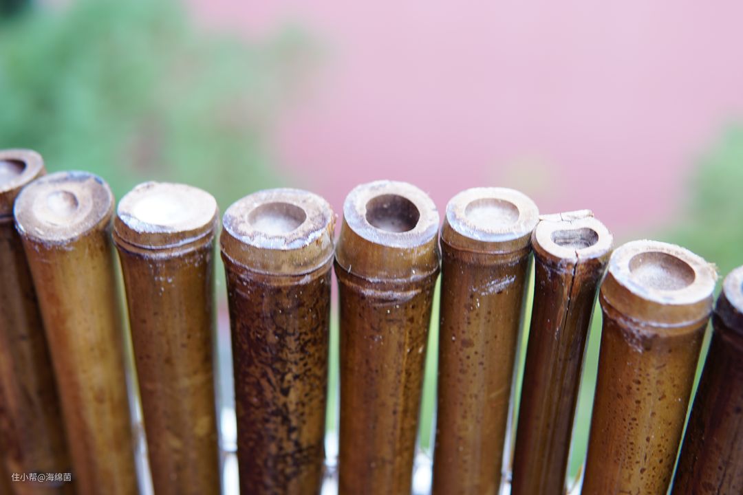 单根竹子会用铁丝串起来,上方的齐平切断处一般会在竹节处,这样就能有效防止积水,竹子就不容易从内部腐坏。当然也会有漏网之鱼,看下图中间那一根,毕竟人做的工作都会有差错,要求也不能太高了。