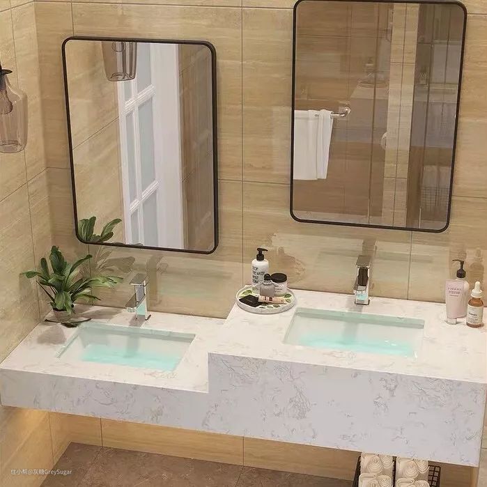 如果家里人口多,空间又允许,真的可以考虑双台盆。完美避免亲戚朋友来访、以及工作日早上产生的使用冲突。高低式的双台盆对小孩更加友好。