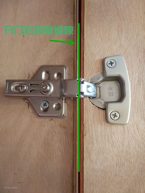 如果虽然柜门歪了,却没有出现任何问题,只是不好看。此时我们可以打开柜门,通过柜门与柜体之间的缝隙来判断柜门是向哪一侧歪了。调整的原则是,哪里缝隙大,就顺时针旋转哪里的螺丝。比如柜门和柜体之间上半截缝隙大,越往下缝隙越小。那就顺时针旋转最上面铰链上的调节螺丝,把上面的缝隙变得和下面一样大。