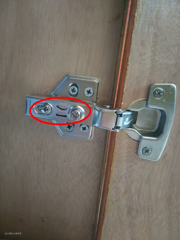 上图中被圈起来的两个螺丝,就是铰链的调节螺丝。后面(左边)那一颗螺丝的主要作用是固定(下文称为“固定螺丝”),也可以用来对柜门进行大方向的调节。前面那一颗(靠近柜门的那一颗)螺丝的唯一功能就是调节(下文称为“调节螺丝”),一般柜门的小幅度移动,可以用它来实现——你也可以理解为微调。