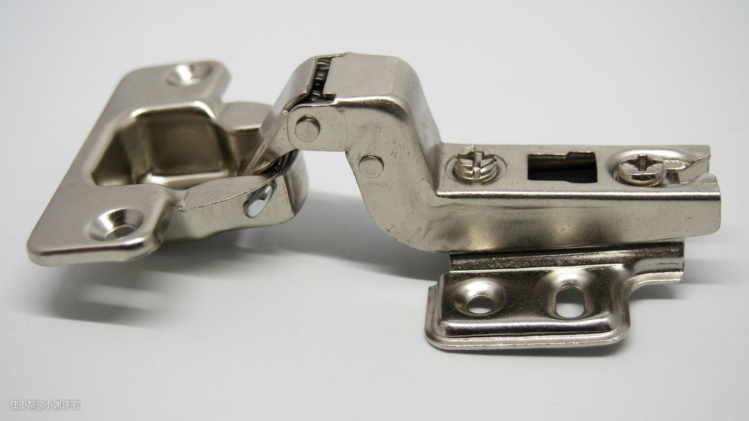 这个东西前凸后平,像不像个飞机?所以它又叫“飞机合页”。当然除了这个非常卡通的名字以外,它还有很多更显专业的名字,比如合页、铰链、弹簧铰链等等。我们不去纠结它究竟应该叫什么,只需要知道它关系到柜门的开关即可。