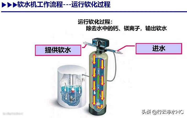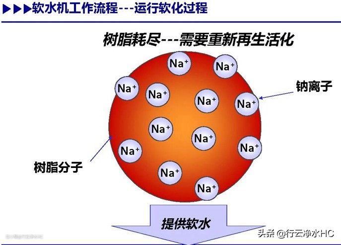 自来水在一定压力和流量下流经软水机,树脂中所含的Na+与水中Ga2+,Mg2+等进行离子交换,大大降低水的硬度从而得到软水。