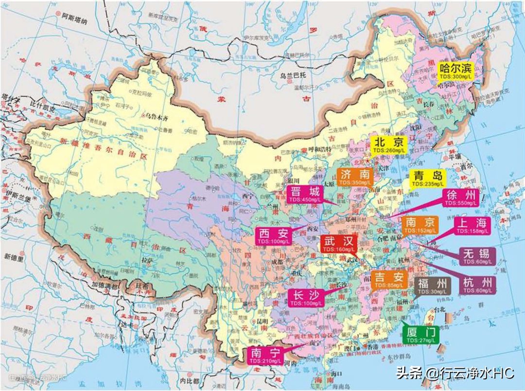 ●哈尔滨:以前松花江污染,现在都用磨盘山的水,硬度不高,杂质多,有的含铁、锰、氟