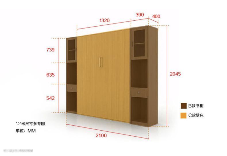 侧翻壁柜床分单人和双人两种,一般侧翻壁柜单人床是1.5m*2.1m;双人床是1.8m*2.3m。