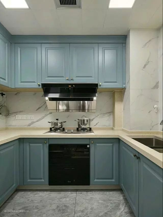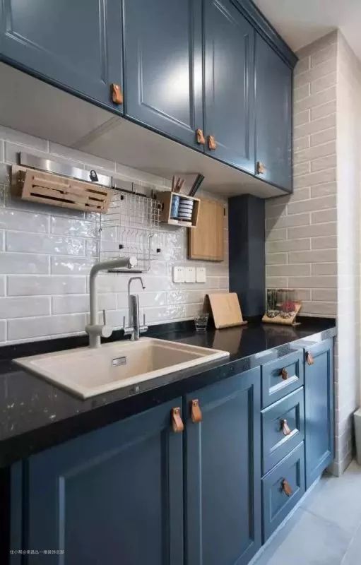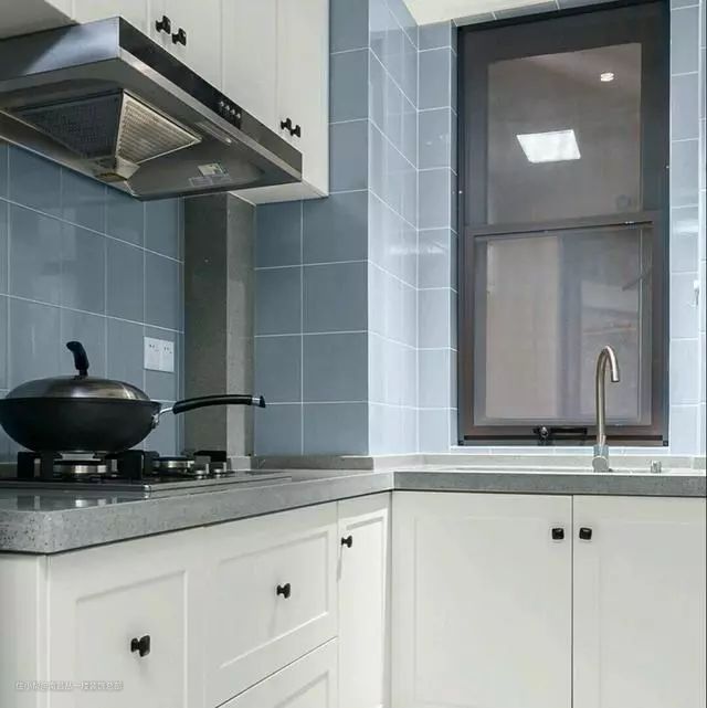 这是一套北欧风厨房,面积不大,选择了L行橱柜,选择了蓝色砖是为了和家里的风格统一,菱形方格地砖为了呈现立体美感。