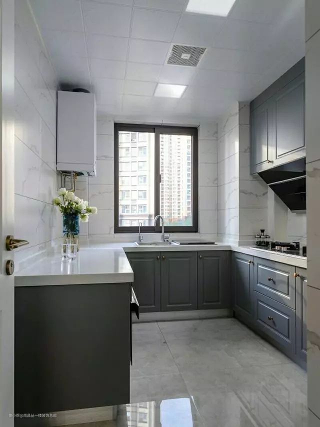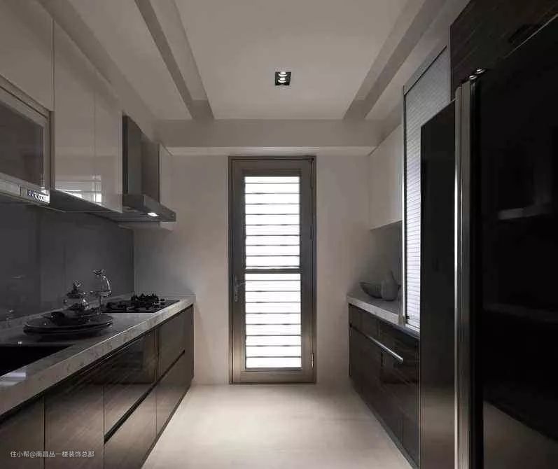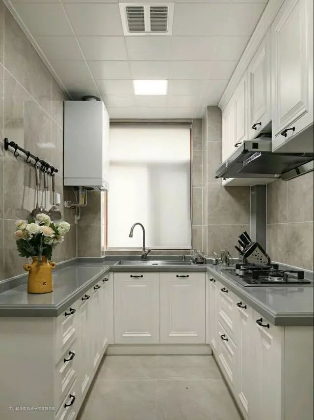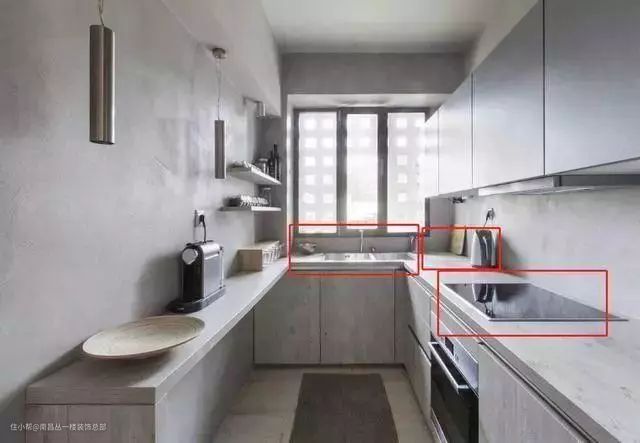 双一字型厨房,可以将洗放在靠窗的区域,炒和切放在一个区域,即使需要180°旋转,也不影响做饭效率。