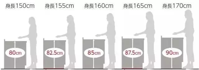 通常厨房台面高度为80-90厘米,确定方法为:操作者前臂平抬的高度 - 10到15厘米 = 厨房台面最佳高度。