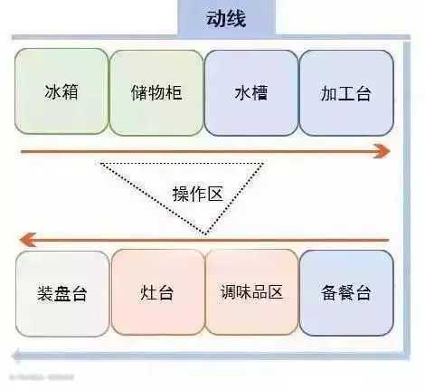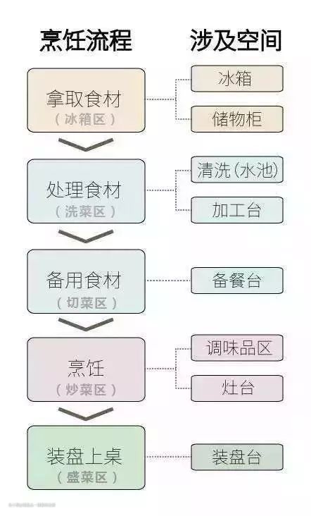 我们先来说一说厨房的布局,我们需要确定好做菜顺序的先后,一般做菜的时候顺序为:取出食材—清洗菜品—切菜备菜—炒菜—装菜上菜。这是我们做饭炒菜的基本顺序,在设计的时候按照这个动线来进行设计会让我们厨房的使用效率发挥到最大。