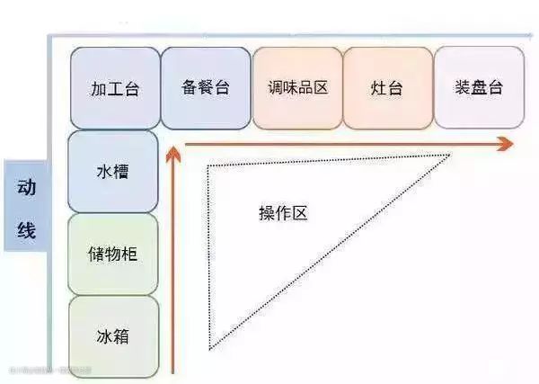 狭长形厨房,宽度大于1.5m,L型厨房最实用。功能强大,可以满足储物区、准备区、烹饪区等。它的活动区域是个黄金三角动线。在厨房做饭,你可以在一个三角形区域,去到厨房的任何地方,省时间、操作方便。但是,左边的台面最大不能超过2.8m,要不然做起饭来像跑马拉松。