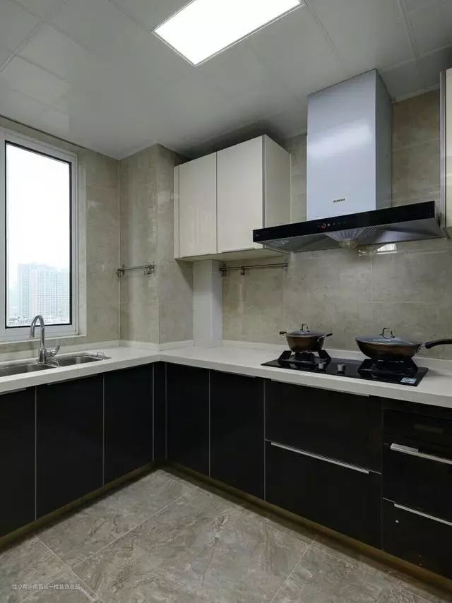 厨房色彩会比较暗一些,也是为了呼应家里的风格,也显得稳重和简洁,这里选择的是L型橱柜,通常我们会根据厨房实际情况合理选择L或U型的橱柜。