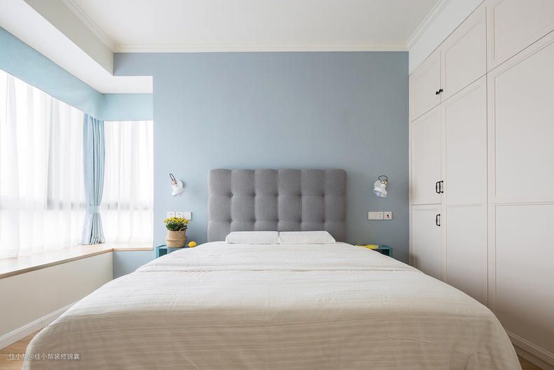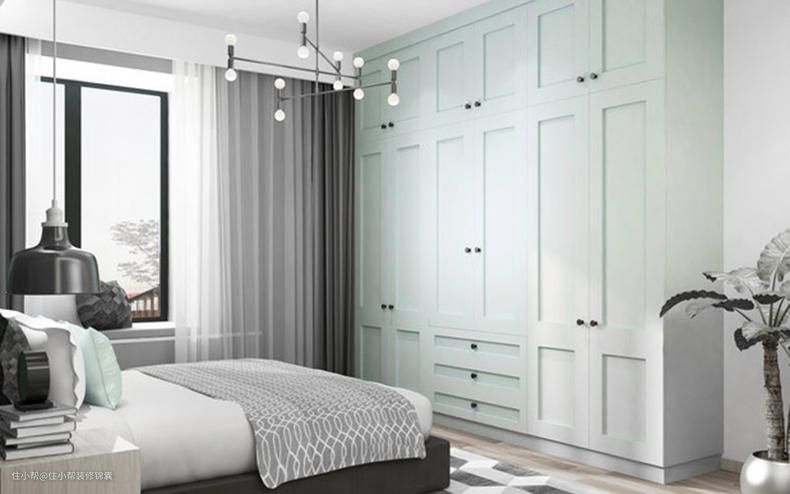 这个衣柜属于百搭的案例,不仅适合北欧风卧室,同时也适合其他风格的卧室,白色的衣柜设计的简洁大方,与高级灰色的床头背景墙非常好的搭配在一起,显得非常时尚有层次感。