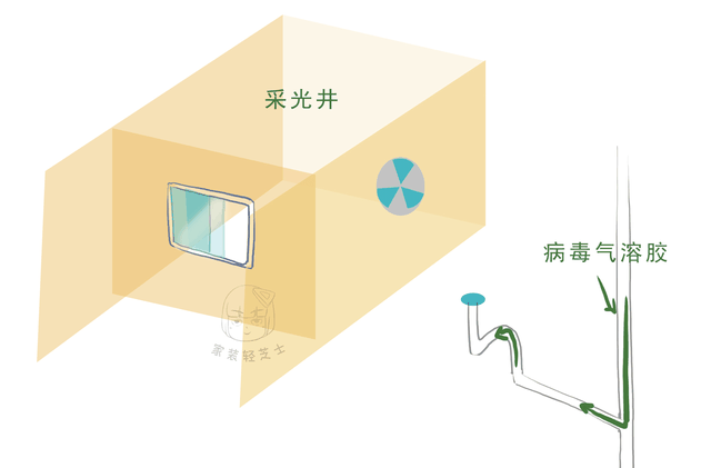 如果这时管道中的气体已经被污染,再通过排风扇抽取到附近的采光井里,周围的邻居又刚好打开采光井一侧的窗,那感染的范围就会更大。