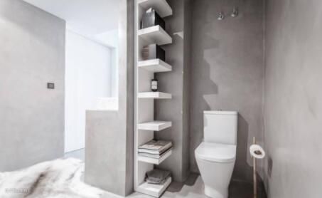 卫生间也大量用了水泥设计,配合上白色的用具,这么看起来倒有几分极简的高级感。
