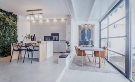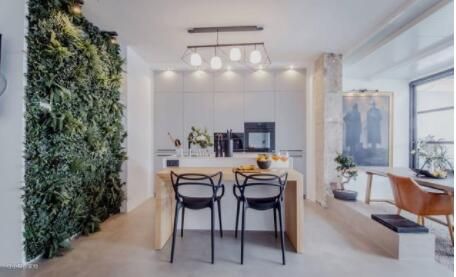 厨房旁边还设计了一整面的绿植,中间则是一个连着小吧台的小岛台,吧台用了实木设计,搭配上白色的橱柜,高级又温馨。