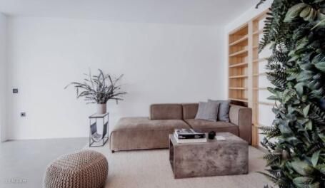 再往里就是客厅了,客厅的地面和玄关的地面是一体的,都是水泥自流平,而且客厅还隐隐有些实木元素搭配上绿植,看起来明亮又温馨。