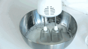 然后转高速档打发,细砂糖加入之后蛋白霜会变软,蛋白霜发泡之后会慢慢变硬,转低速,然后蛋白霜开始有阻力,打蛋器会慢慢变重。打蛋器要垂直对着蛋盆,在蛋盆中间画圈慢慢搅打,这是为了使蛋白霜形成均匀的小气泡,把大气泡都吸走,一直打发到提起形成尖勾的发泡程度(干性打发),千万不要打发过度。