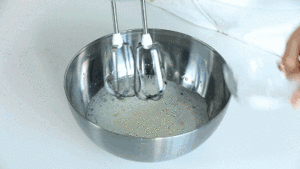 - 继续打发至粗泡消失变成小细泡时加入第二份糖