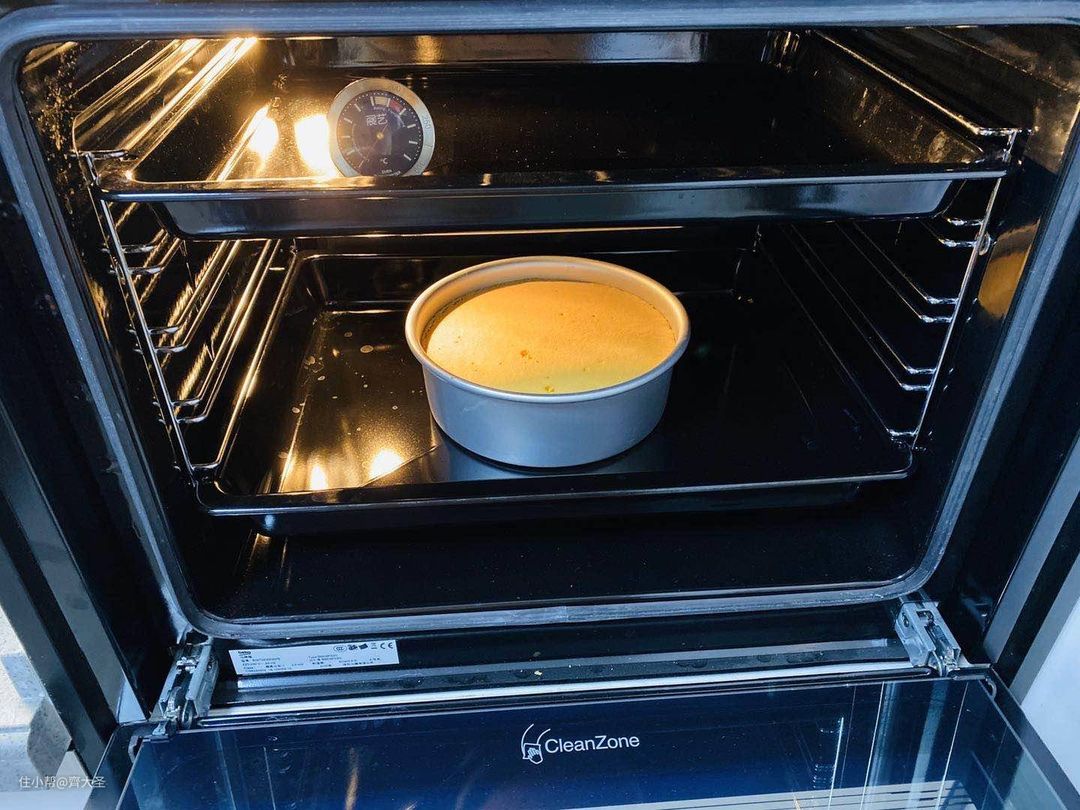 放入烤箱中下层(如果是小烤箱离下管太近温度过高可以垫上一个烤盘)上下火150℃烤60分钟。由于烤箱大小温控都不一致,时间仅供参考,上下浮动10分钟都是正常的。目测判断就是表面隆起一定高度又稍微往下塌一点,就是熟透了。要是不确定,可以插根牙签进去,要是没有面糊带出来就是烤好了。