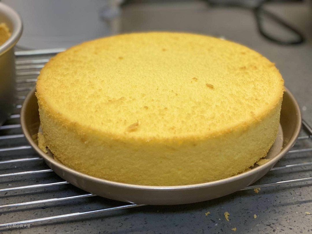 烤好的戚风拿出来之后要在桌子上空15-20cm高度摔下去,一两下就行,把蛋糕里的热气震出来。然后架空倒扣至完全放凉再脱模,不完全放凉再脱模的话容易“收腰”。我是晾了两个小时。
