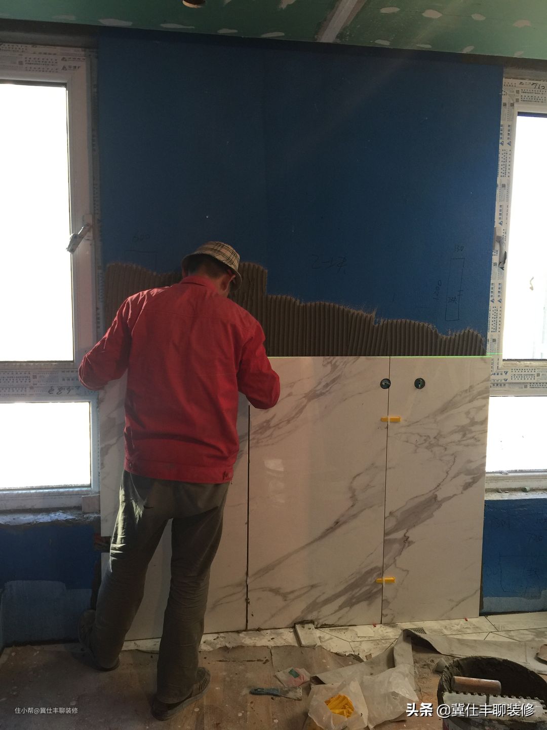 这就是秀巢网小编突击检查工地的时候,瓦工师傅正在铺贴600×1200的陶瓷大板呢: