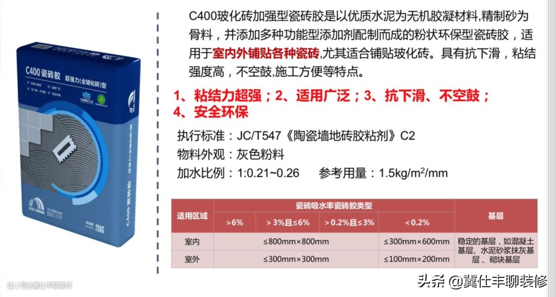 上面的提升手段理论上是可行的,但考虑到人和人工的复杂性,我们往往不如直接提升瓷砖胶的型号来得更可靠,比如把C200提升到C400,甚至提升到C500,提升到在墙上铺贴1600×3200mm大板的程度也是没有问题的。下图是C400型号,可以看到粘贴性能比C200已经大大提高了。
