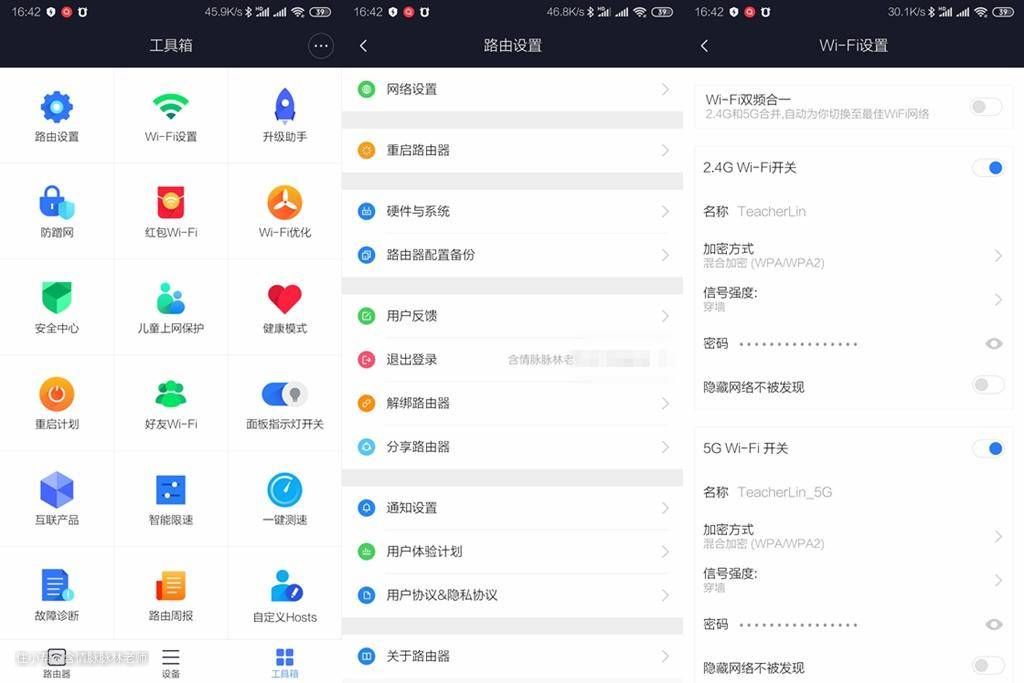 ▲感觉APP端的设置内容要比PC端丰富,限速,测速,指示灯开关,微信好友WiFi,儿童上网保护,防蹭网,等等功能都可以在工具箱内部配置。