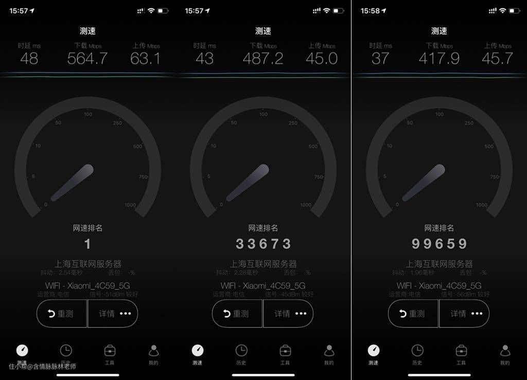 ▲接入电信500M宽带使用的情况下,使用IPHONE11跑一下测试,客厅的信号最高,而其他两个卧室基本都在400M以上。由于5G 信号本身传输距离短,容易被墙体阻隔,所以在远距离传输上要低于2.4G WiFi信号。