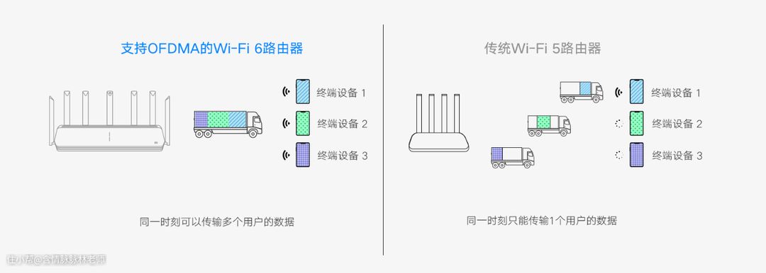 而传统路由器则需要先后轮流多次传输才可完成多终端设备的数据发送。OFDMA使得多设备同时工作的传输效率显著提高,延迟明显降低。