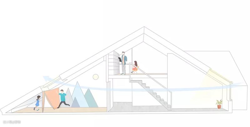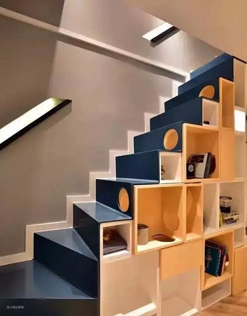 紧挨着客厅的就是楼梯了,楼梯就在沙发的旁边,楼梯也是不规则的,看上去更像是游乐场的滑梯,楼梯旁还打造了收纳格子,收纳小物件很是实用。