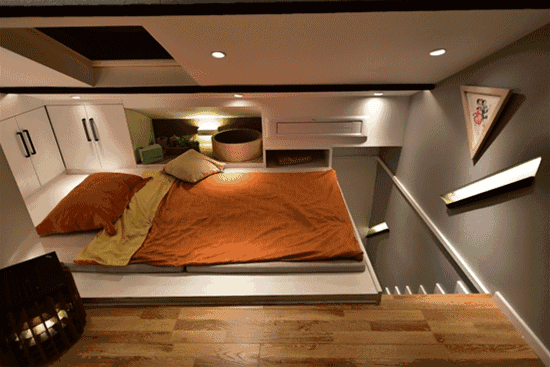 虽然只有26㎡,但是因为是复式设计,所以室内打造了很多间卧室,主卧面积是最大的,床下发的空间还可用来收纳,为了采光还打造了天窗,白天可以晒太阳,晚上可以看星星。