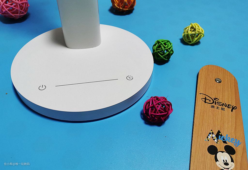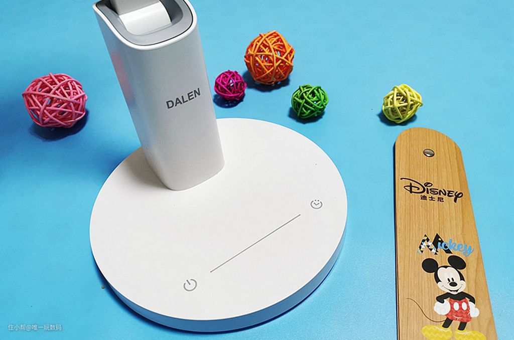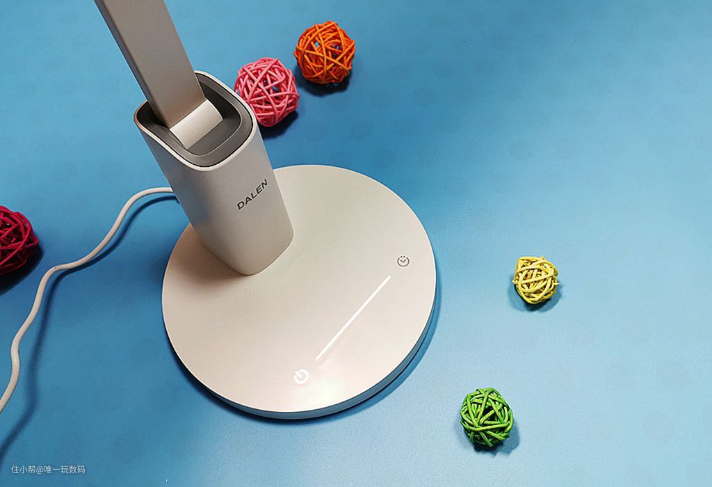 达伦DL-31W台灯的另一创新之处在底座,底座设计无按键,而是采用高灵敏的触摸模式,触控区域的面板是纯白色,从左到右,分别为台灯开关按键、亮度调节条和定时课堂模式按键。