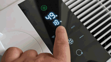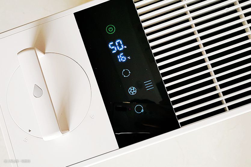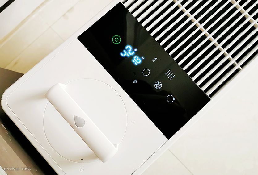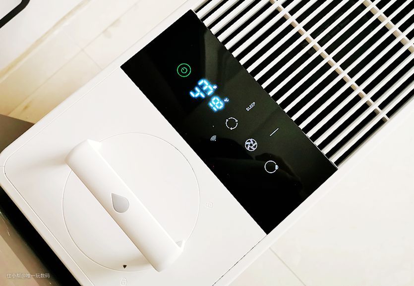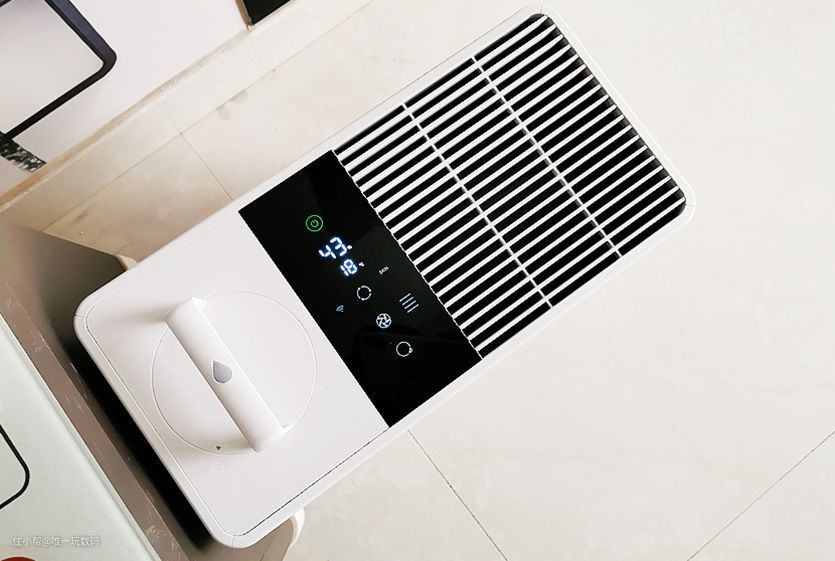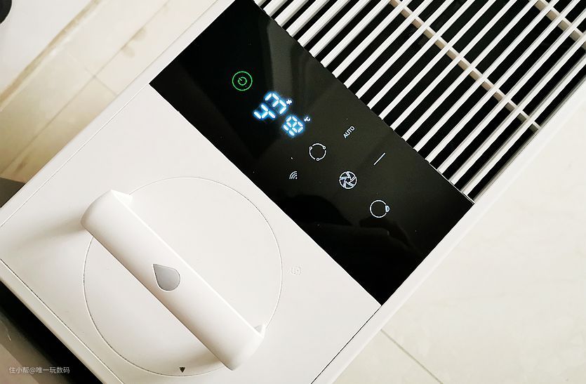 中间的液晶显示屏幕(贴纸保护)让整个加湿器的科技感更加强,正常接通电源后可以看到开关机键背光灯点亮;从上往下,显示了开关、室内湿度温度、加湿模式、风量、童锁等指示灯,加湿效果变化通过屏幕显示一目了然,交互方面只要手指轻触即可,控制反馈相当迅速。