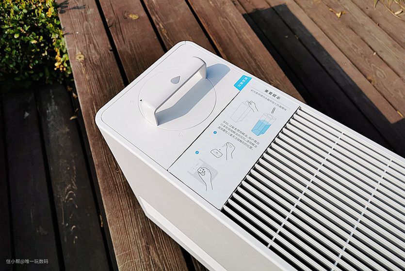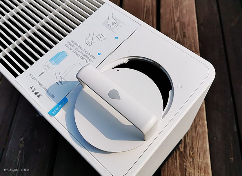 352 Skin自然蒸发加湿器顶部左侧可以看到独立水箱把手,根据图标指示方向,旋转把手就能打开水箱注水。