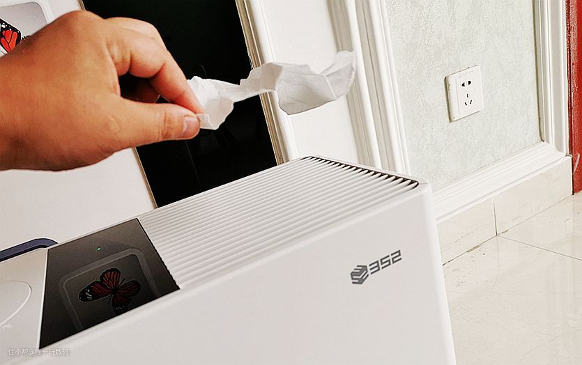 首先我们选择的是市面上常规的加湿器,正好之前媳妇买的小熊品牌的加湿器,一直因为声音大,水雾大问题而闲置,本次再次拿出来进行测试:(将卫生纸放在出风口测试时间30min)