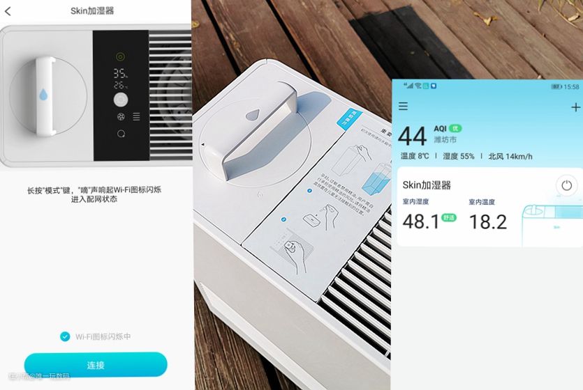 作为一款智能家居产品,352 Skin自然蒸发加湿器不仅可通过其顶部的操控触摸板进行控制外,还可以使用手机APP来远程操控;操作简单,只需要按照说明下载352 Life APP,根据提示添加设备并长按模式转换键打开加湿器无线连接功能,此时会看到按键的旁边出现了一个WIFI图标在闪烁,当连接成功后此图标为常亮。