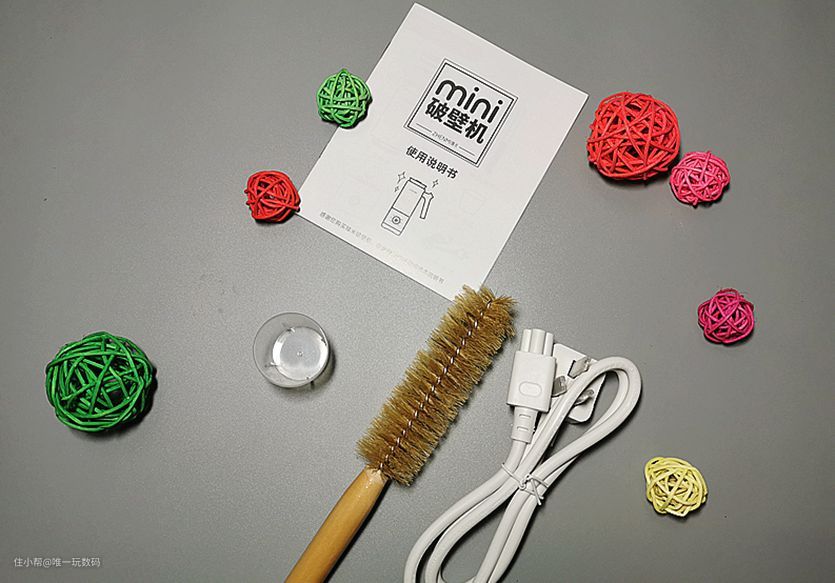 臻米Mini破壁机全家福:搅拌杯、杯盖、机座、电源线、毛刷、量杯以及使用说明书。