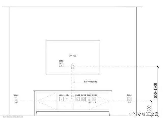 2.1、如有隐藏电源线、视频线需安装在电视柜柜面的下面,一般距地200-300㎜位置。