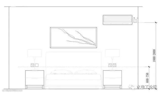 1、床头双控开关及插座安装在床头柜上面,距地600-750㎜是比较合适的距离。