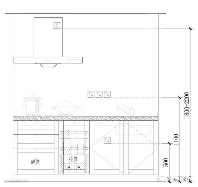 1、厨房所有台面插座距地1100㎜比较合适,建议安装带开关五孔插座。